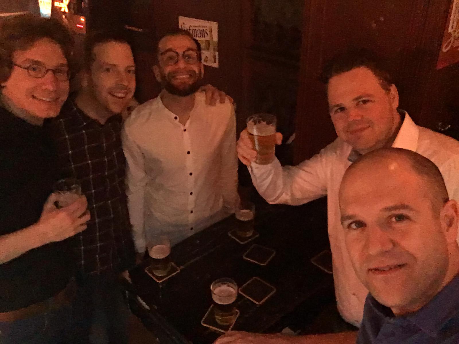 Door vele werd de trein vandaag als ultieme vervoersmiddel gezien. Mede omdat het weer vandaag ook al niet mee werkte. Na de korte treinreis liepen we vol goede zin naar de Trafalgur pub, Tim zou hier al op ons wachten. Mike stormde aangespoord door de regen snel de Trafalgur pub binnen en ondanks zijn lengte keek hij helemaal over Tim heen. Hierbij moet ook wel gezegd worden dat Tim zichzelf aardig had verstopt in de garderobe. De eerste speciaal biertjes werden snel besteld. Maar niet voordat we allemaal vol verbazing keken naar Erik. Om het hipster gehalte van ons nog verder op te krikken, rockt hij tegenwoordig een manbun. En het moet gezegd worden, het misstaat hem niet eens. Iedereen had goed gekeken naar Sander zijn laatste verschijning en had voor zichzelf voorgenomen “dit nooit meer”. Sander als best geklede man is toch een beetje zoals dit tafelbroederschap zonder alcohol. Zowel Mike als Rik, beide in een feilloos wit blouseje. Beide heren hebben vandaag hun uiterste best erop gedaan. De tijd in de Travalgur pub was maar beperkt, dus er werd lekker doorgedronken, echter was er precies tijd genoeg om een schaal met heerlijk bittergarnituur naar binnen te werken.