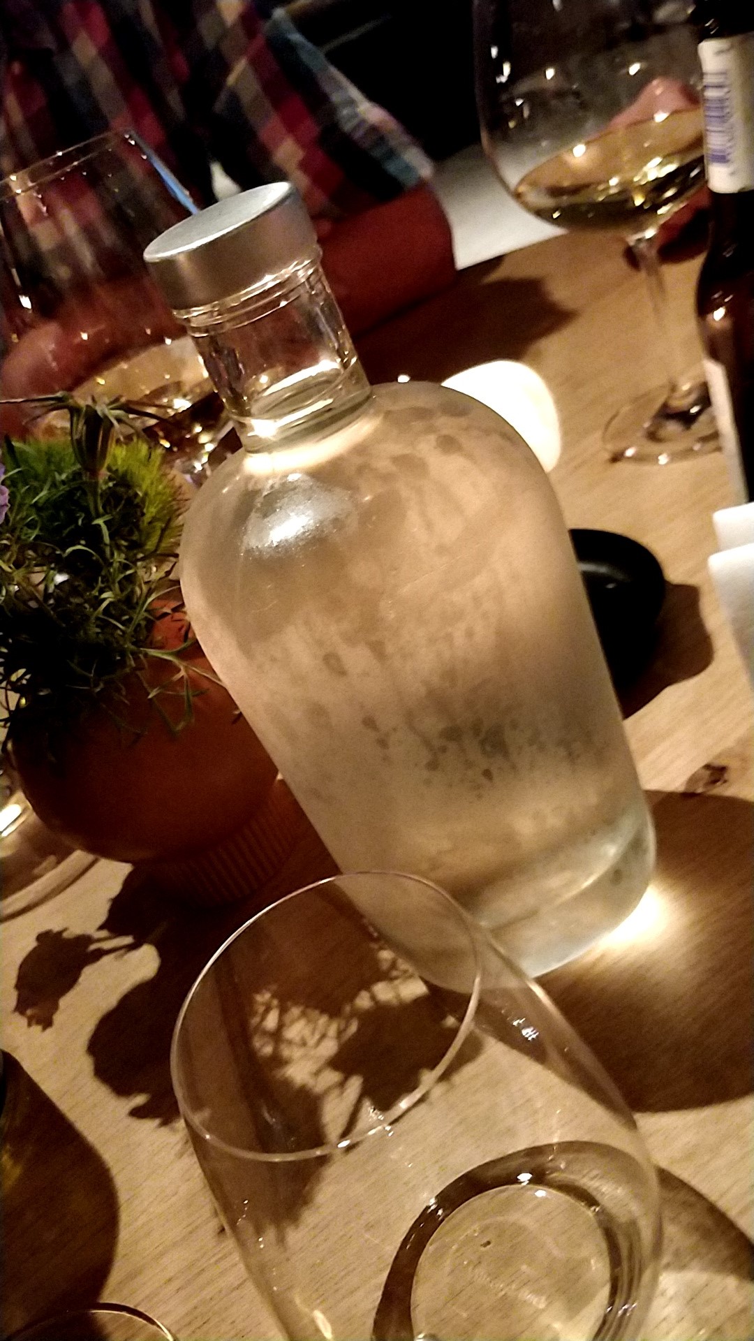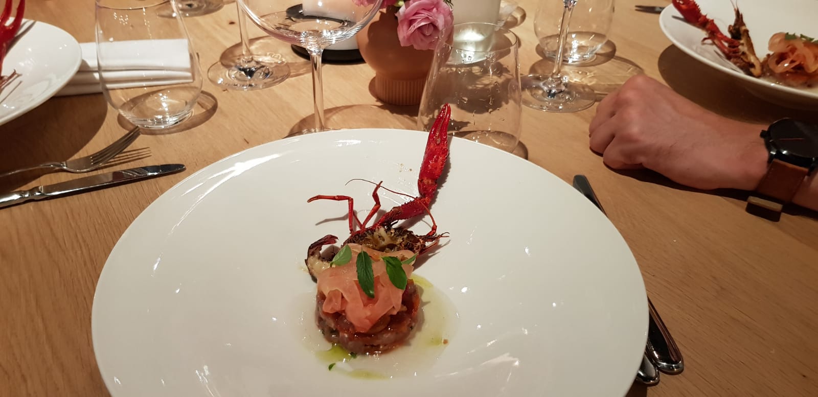 Aansluitend kwam er duif op tafel. Uitgeserveerd door de chef zelf. In het verleden hebben we regelmatig teleurstellende ervaringen gehad met verschillende chefs aan onze tafel. Of we werden genegeerd of niet serieus genomen. Deze chef deed iets puur magisch aan onze tafel. Uit een klein pannetje veel heerlijke saus toveren. Bij elk bord keken we elkaar hoopvol aan op het moment dat er te weinig saus aanwezig zou zijn, maar de beste chef bleef maar scheppen.