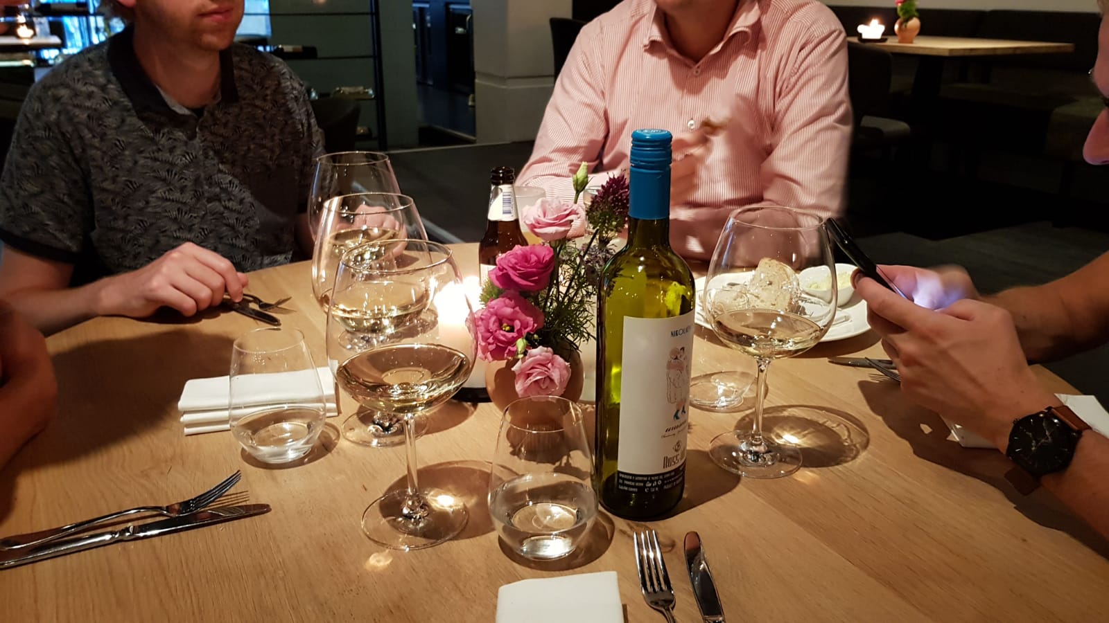 Bij Emma aangekomen blijkt al snel dat het restaurant maar voor de helft is gevuld. Al snel waren we angstig of er wel voor het juiste restaurant is gekozen. Gelukkig werden we met een grote glimlach begroet door de dienstdoende ober. Deze beste man had al snel door dat wij als elitaire eetgenootschap op een bepaalde manier willen worden behandeld. En dankzij zijn aanvullingen waren we al snel op onze plaats in het restaurant. We werden direct bediend met een flesje witte wijn, of zoals onze wijnkenner het benoemde “doe maar de tweede op de kaart”. De tweede op de kaart was een schot in de roos en onze keeltje werden al snel gesmeerd met een hemels sauvignon blanc. Moeiteloos werd er voor ons een amuse op tafel gezet. Kruiden die worden geteeld in de eigen kas, deze kas staat zelfs in het restaurant. De exotische kruiden waren snel op en alle waren we verbaasd over het feit dat wat blaadjes eigenlijk best wel lekker waren. Het werd weer eens tijd voor een verrassingsmenu met eisen. Gelukkig was het verrassingsmenu zonder verrassingen hier ook geen probleem. Alles werd op onze eisen aangepast.