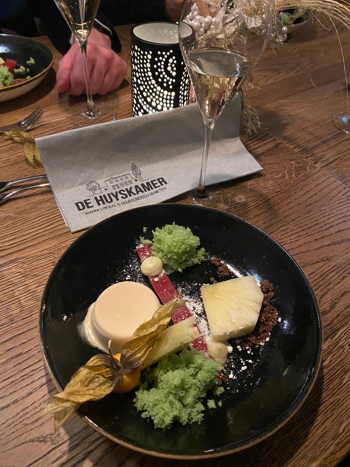 En toen kwam het nagerecht, wat zullen we daar van maken. Bovenal was het een fraai bordje. Het nagerecht zelf was ansich oké. Het is wat ijs, wat rabarber, wat crumble en wat mouse. Hiernaast lag er ook nog een ananas op. En daar zat nou precies het probleem. Dit was geen lekker zoet stukje ananas. Maar het meest zure stuk ananas dat er ooit aan een boom heeft gegroeid. En wie nu denkt, dat ananassen niet aan bomen groeien heeft helemaal gelijk. Deze ananas echter wel, zo zuur was ie. De tranen stonden bij ons allemaal in de ogen, maar strijders dat we zijn hebben de meeste van ons het wel gewoon opgegeten. Toen de gastvrouw kwam vragen of het eten smaakte. Werden er toch wel wat vertwijfelde blikken over de tafel gegooid. Voor het eerst in ons bestaan van het tafelbroederschap hebben we toch even vermeld dat de ananas niet te knauwen was zo zuur. Niet veel later kwam de gastvrouw gelukkig terug om ons gelijk te geven. Helaas voor ons doen ze in Gilze niet aan wat compensatie, dus met een glimlach werden we afgescheept.