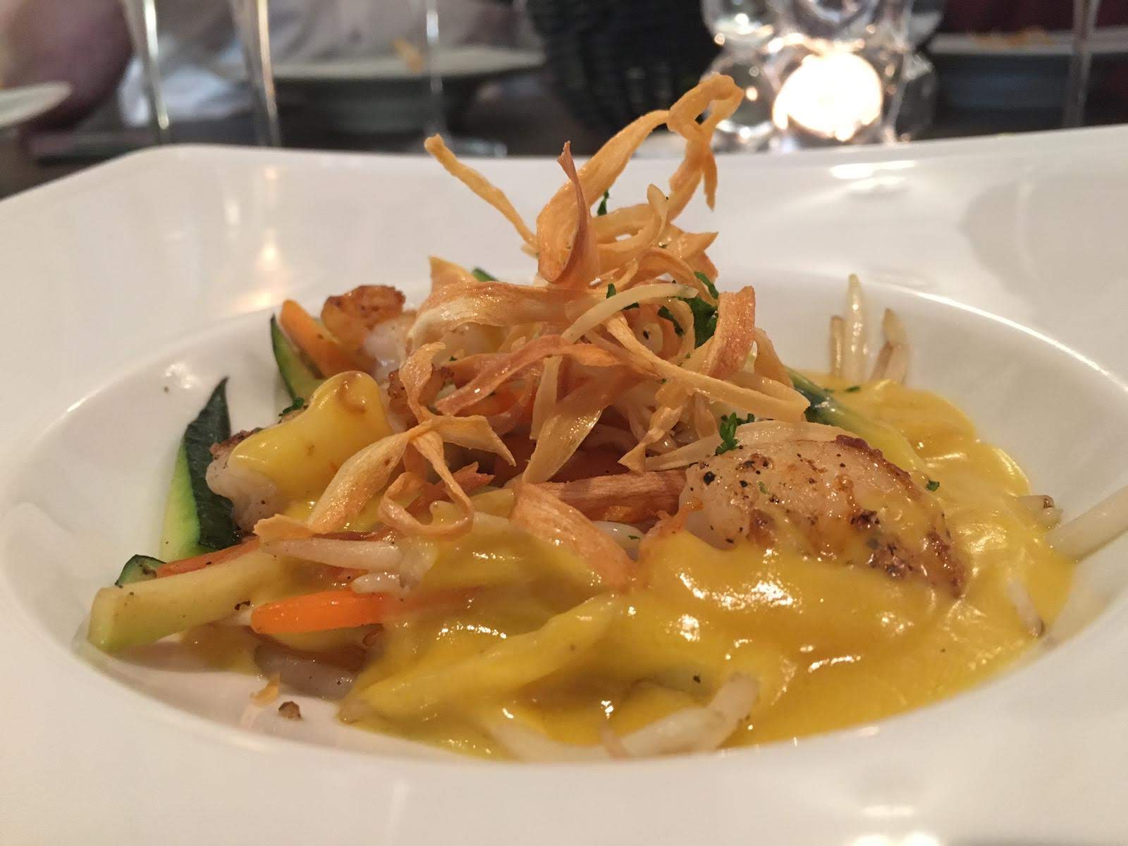 We zijn niet zo erg van de soep. Begrijp me niet verkeerd, het was lekkere soep, maar wij houden toch iets meer van vast voedsel. Dus we zijn allen blij als het tijd wordt voor het eerste hoofdgerecht. We worden verrast met een heerlijk gamba gerecht en hierbij wordt ook een zachte droge rosé geschonken. We zijn normaal niet zo van de rosé, dus dit was een verrassing voor ons. Een aangename verrassing moeten we eerlijk toegeven. De aardse tonen van de rosé passen uitmuntend bij de kerrie saus die bij de gamba’s wordt gereserveerd. We merken toch echt wel dat we alleen in een restaurant zitten en langzaam maar zeker worden we ook steeds iets luidruchtiger, er is toch verder niemand waar we rekening mee moeten houden. Net als we op het moment komen dat het gesprek richting tarrels wordt gestuurd, komt de enige andere gast die buiten op het terras plaats heeft genomen binnen zitten. In een leeg restaurant, langs ons. Van alle plaatsen die leeg zijn, kiest de mevrouw de tafel uit langs ons. We zijn al dermate lang bezig dat dit ons er niet van gaat weerhouden om door te gaan waarmee we al waren begonnen, deze boot is al lang vertrokken en het lijkt erop dat het een goede partyboot is. De wijn doet wederom zijn werk en we praten lekker door met zijn vijven. Al snel valt op dat mevrouw bewust de tafel langs ons heeft gekozen om met onze gesprekken mee te luisteren. De wijn heeft erg zijn werk gedaan bij Nick en deze jongen begint zich over dit feit een beetje op te winden. Net hard genoeg dat zelfs de chefs achter in de keuken dit gehoord zullen hebben. Maar mevrouw blijft stoïcijns voor zich uitstaren, genietend van haar kopje koffie en een luisterend oor richting onze tafel draaien. Wij besluiten dus maar om er nog een schepje bij op te doen. Vol enthousiasme strooien we de anekdotes van vroeger over de tafel. De verhalen van andere panjoel's komen voorbij, de carnavalsavonturen van Erik, de feesten bij Sander vroeger thuis. We springen van de hak op tak. Niks is ons meer te gek en net als we ons zorgen beginnen te maken is het tijd voor het volgende gerecht.