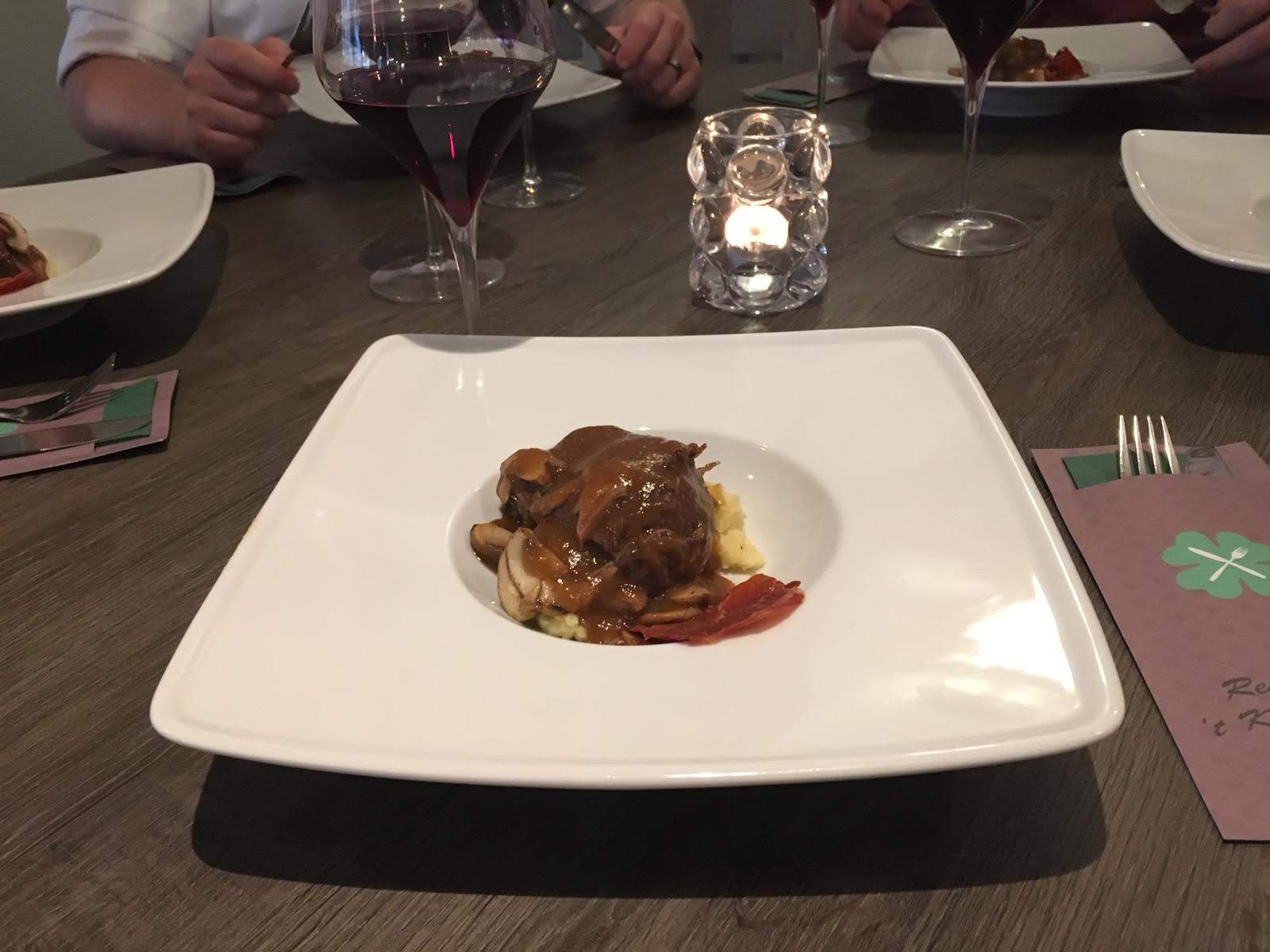 We worden als laatste verrast met een prachtige sukade bedekt onder een hemelse jus, samengemengd met champignons. We zijn als eetgenootschap niet snel stil, maar hier nemen we even de tijd voor. Nadat het gerecht door ons allen is opgepeuzeld, kijken we elkaar vragend aan. Is dit de hemel?? Een leeg restaurant, goed gezelschap en heerlijk vlees. Zo moet het er toch uitzien volgens ons. Terwijl we dit bedenken, worden we verrast met de volgende verrassing. Erik had ons al gewaarschuwd dat er geen kaasplankje op het menu staat. Echter de chef is zijn boekje te buiten gegaan en heeft vanmiddag in allerijl speciaal voor ons gezelschap een kaasplankje samengesteld. Alleen vandaag, alleen voor ons. Ze weten in Bladel bij het Klavertje wel hoe ze aan klantenbinding moeten doen. Al ruim 5 jaar gaan we uit eten, in deze periode hebben we tientallen restaurants bezoekt in verschillende plaatsen in Nederland. Maar dit heeft nog niemand voor ons gedaan. Speciaal voor ons een gerecht samenstellen. De lat wordt voor de komende etentjes wel direct hoog gelegd. En er bestaan direct twijfels of er hier nog ooit aan kan worden getipt. Over het kaasplankje, het was heerlijk. Als de chef dit in een middagje kan klaarmaken, wil ik wel eens weten wat er gebeurd als hij een week de tijd heeft.