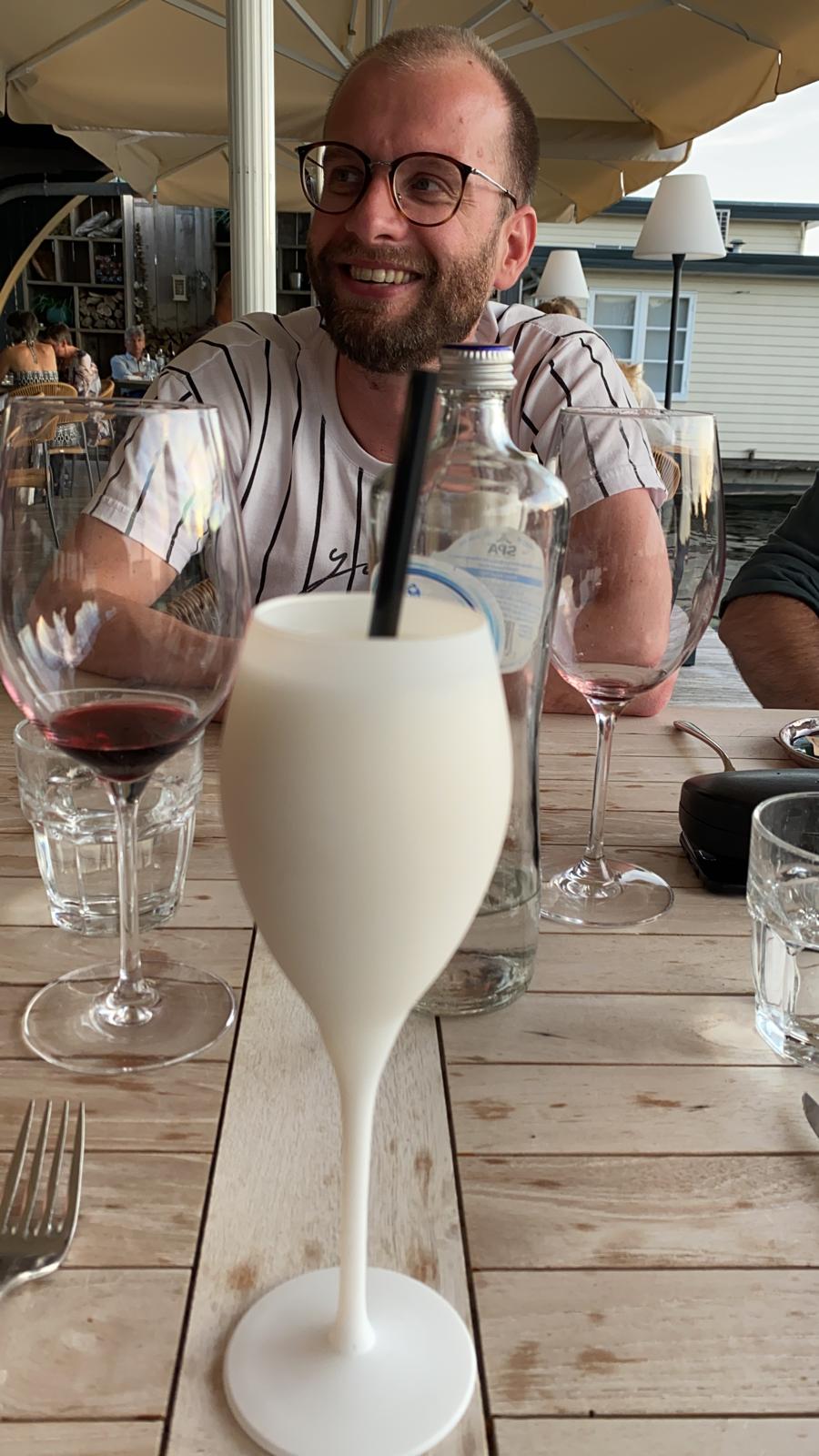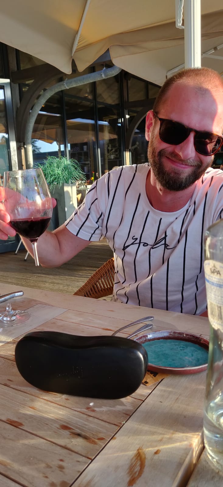 Terwijl er rustig op de achtergrond bootjes voorbij kabbelen beginnen we aan de eerste fles wijn. Tim komt net ietsjes te laat aan, maar voor deze ene keer zien we het graag door de vingers. Vandaag is ook weer de eerste keer sinds tijden dat Tim niet met de auto is moeten komen, dus vandaag mag hij lekker met ons mee drinken. Al snel krijgen we een heerlijk aperitiefje van de chef en hierna beginnen we al snel aan ons gebruikelijke menu. We kiezen deze keer een wijntje uit en hier blijven we lekker heel de avond bij. De flessen vinden snel onze tafel en gecombineerd met de locatie maken we ons op voor een heerlijke avondje. Iedereen die naar de wc gaat staat echter voor een verassing. Deze is namelijk nogal verstopt in het restaurant en haast iedereen loopt eerst een green egg showroom binnen in plaats van de wc. We laten ons hier echter niet door van slag brengen, want je kan ook gewoon een boodschap doen in een green egg. We ontvangen van de chef een heerlijk 5 gangenmenu met natuurlijk een afsluitend kaasplankje. Dit samen met de wijnen beloofd een heerlijk avondje te worden. Wat we allemaal op hebben is gebruikelijk een beetje wazig, maar het was weer goddelijk. Wat vlees, wat vis, wat anders. Frites bij het hoofdgerecht en tussendoor erg veel wijn om het allemaal weg te spoelen. Goed hydrateren is en blijft de basis tot succes en god wat hebben we gehydrateerd deze avond. Iedereen gaat er heerlijk op. Dion doet vandaag zijn best om de schoenen van Sander en Nick te vullen. Rik heeft de rol van huisfotograaf overgenomen van Nick. Dus eigenlijk missen we de jongens vanavond niet eens.