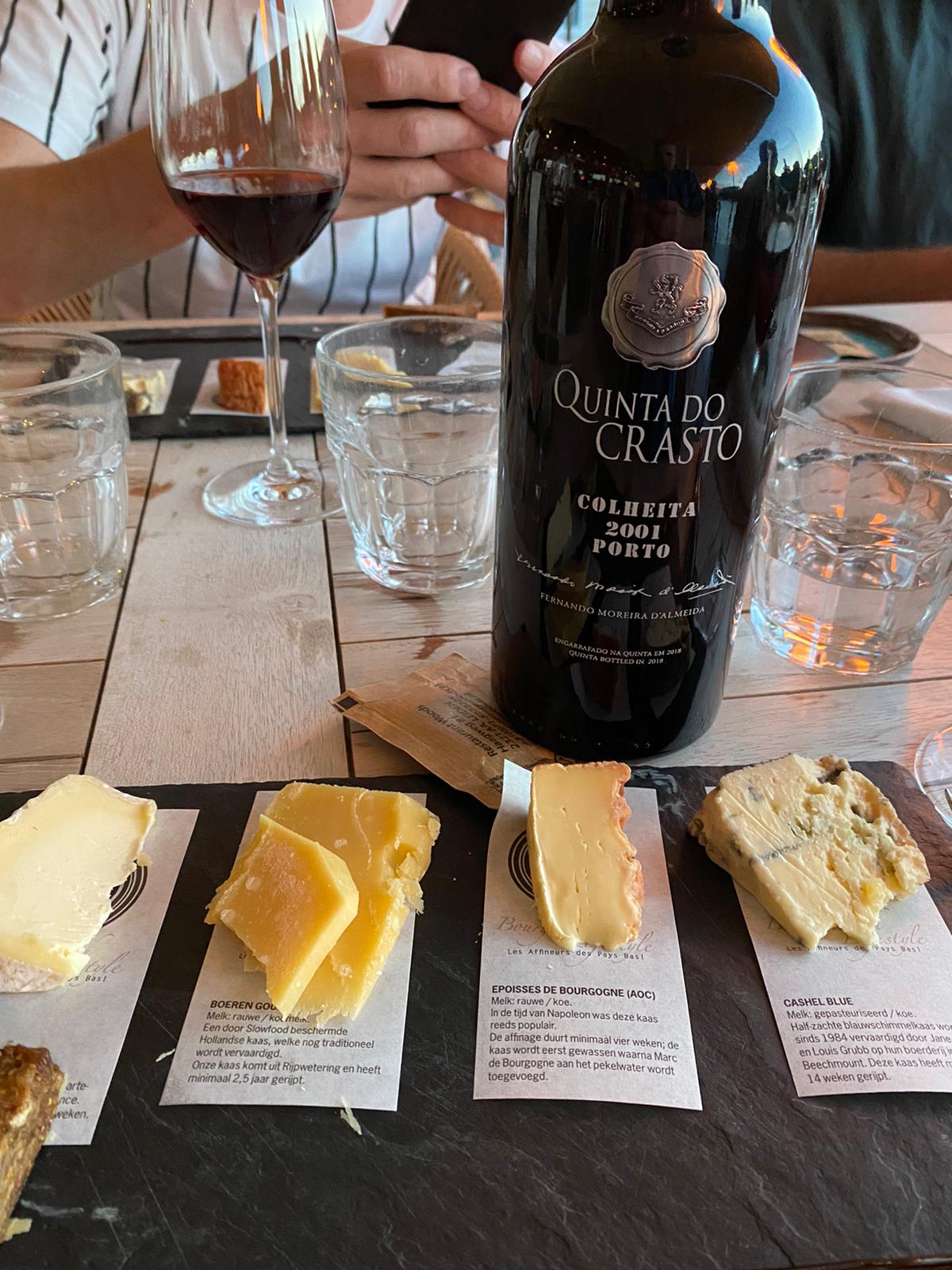 Na het menu wordt het tijd voor een heerlijk kaasplankje. Dit kaasplankje wordt een beetje cheap ass gepresenteerd. Ze weten in Leiden niet veel over de kazen, dus onder elke kaas ligt een geprint papiertje met de uitleg over de kaas. Schijnbaar is het voor de staf van obers te moeilijk om vier kazen uit hun hoofd te leren en hier een verhaaltje bij te vertellen. Over de port bij de kaas kennen ze weer wel een leuk verhaaltje. Mike interesseert het allemaal niet meer en schreeuwt meteen dat er maar 4 glazen gebracht moeten worden. De port was erg lekker, maar toen we de rekening gepresenteerd kregen waren er wel enkele boze blikken richting Mike dat hij de ober niet uit heeft laten praten. Er is schijnbaar voor de duurste variant port gekozen.
